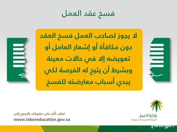 كشفت وزارة العمل عبر حسابها على تويتر أنه لا يجوز لصاحب العمل فسخ العقد دون مكافأة أو إشعار العامل أو تعويضه إلا في حالات معينة، وبشرط أن يتاح له الفرصة لكي يبدي أسباب معارضته للفسخ.